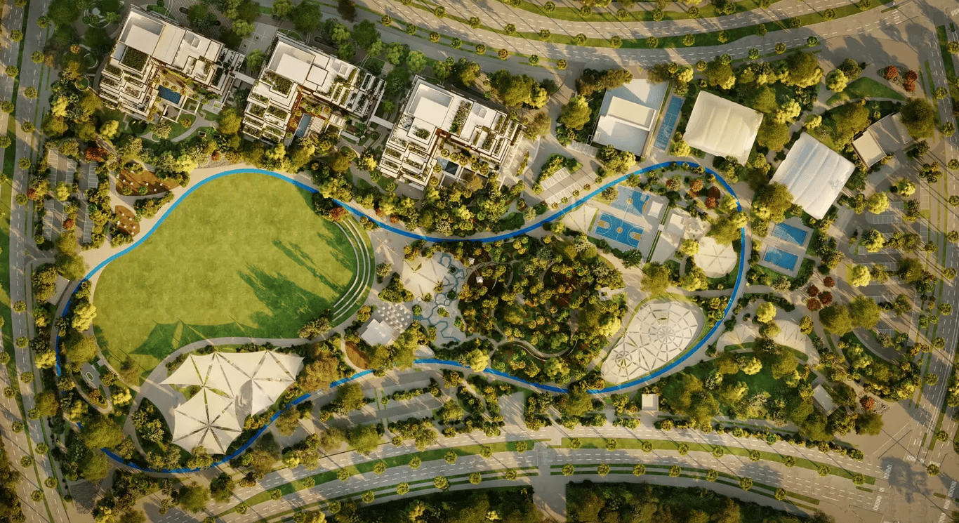 Running track, sports fields, tennis courts, shaded walkways, and picnic lawns
