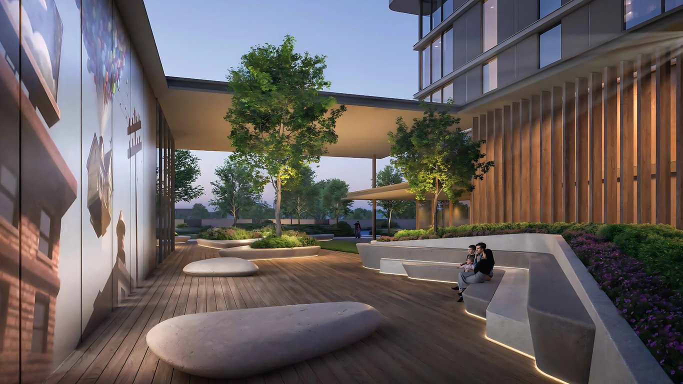 The interiors showcase premium finishes, enhanced by expansive panoramic windows that fill spaces with natural sunlight. Warm, sunset-inspired tones create a soothing ambiance, complementing the sustainable design elements, such as smart insulation and passive cooling technologies.